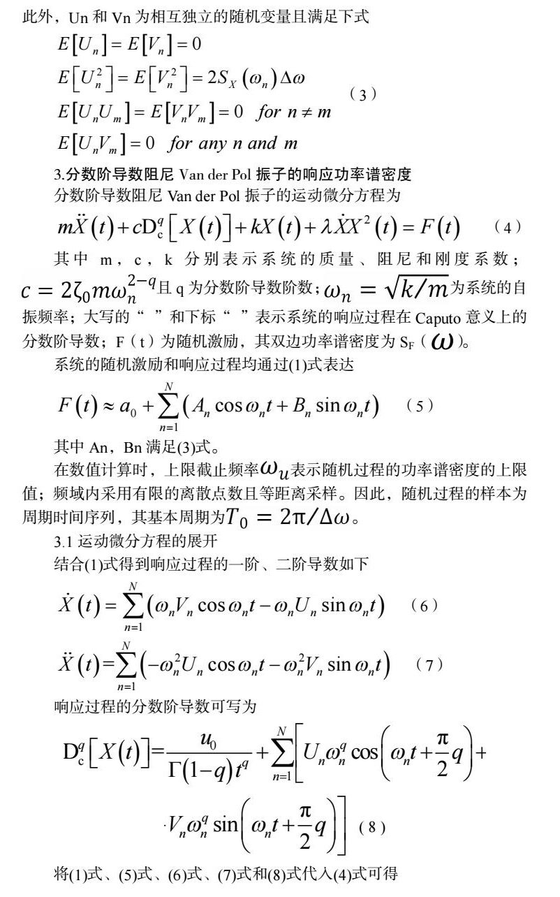 本文研究的分数阶导数阻尼Van der Pol振子是一个经典的分数阶导数非线性系统,所采用的求解方法基于Monte Carlo模拟方法的框架。Monte Carlo模拟方法可分为时域Monte Carlo模拟方法和频域Monte Carlo模拟方法,前者的计算成本往往和样本函数的时间步长相关。本文推导了分数阶导数阻尼Van der Pol振子功率谱密度的频域求解方法,将具有更高的计算效率。
