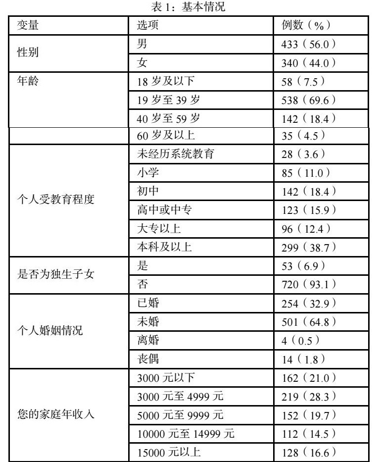 在本次研究中,男性为433人、女性为340人。从年龄层次划分来看,本次调查中年龄主要划分为四组,其中青年(19岁至39岁)为538人,占总人数69.6%,占比最高;老年(60岁及以上)为35人,占总人数4.5%,占比最低(详见表1)。