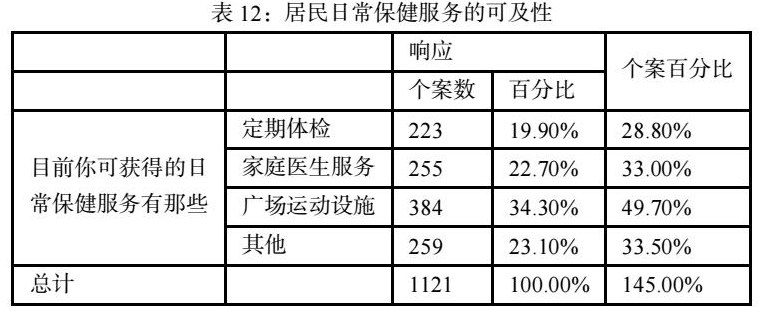 在对家庭收入与获得的日常保健服务研究分析中,家庭年收入在15000元以上人群中有65.6%的人可获得广场运动设施服务,相较其他收入水平人群的广场运动设施可及程度最高,家庭年收入在3000元以下的却仅有35.2%的人可获得广场运动设施服务。