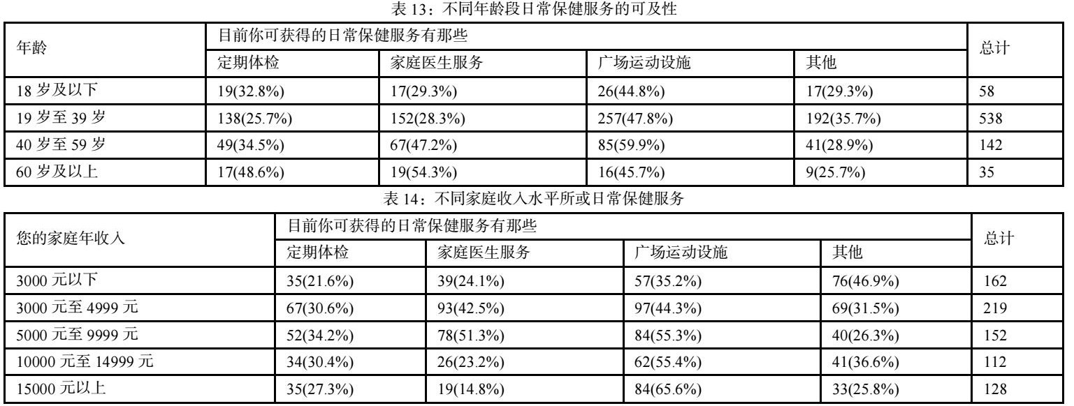 在对被访者可获得的日常保健服务调查中,响应人次共计1121人次,选择广场运动设施的有384次,占总响应人次49.7%;选择定期体检仅有223次,占总响应人次28.8%,说明样本所在地区中,定期体检相关医疗服务覆盖不广。将可获得日常保健服务项目分别与年龄、家庭年收入做交叉表分析,结果显示年龄在60岁及以上人群有54.3%可以获得家庭医生服务,有48.6%可获得定期体检服务,相较其他年龄层被访者,此两项服务的可及程度最高。在家庭年收入方面,家庭年收入在15000元以上人群中有65.6%的人可获得广场运动设施服务,相较其他收入水平人群的广场运动设施可及程度最高,且收入水平与该项服务呈现正相关(详见表12~14)。
