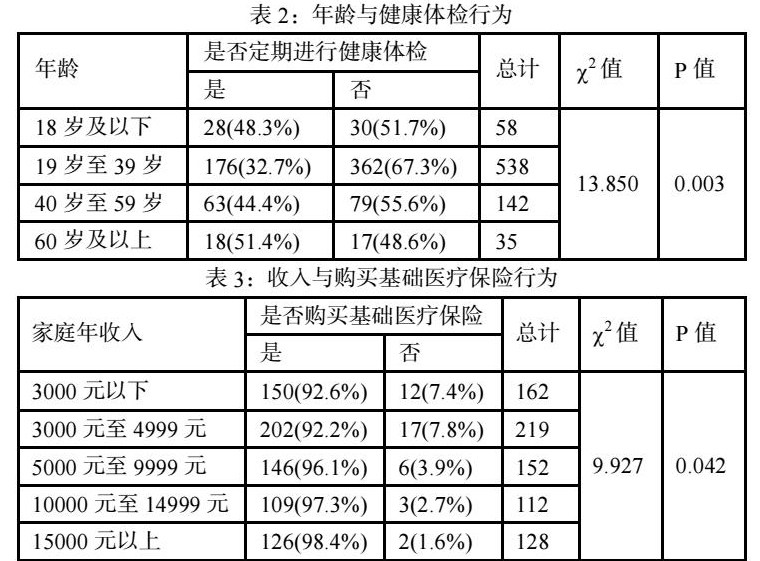 对是否定期进行健康体检与年龄做卡方检验,检验水准取0.05,结果显示2=13.850,P<0.05,差异具有统计学意义。将健康体检行为与性别、家庭年收入、受教育程度分别做卡方检验,P>0.05,差异无统计学意义。在对影响购买医疗保险因素进行分析时,卡方检验显示不同年龄、收入的人群,其购买基础医疗保险的情况不同(详见表2~4)。