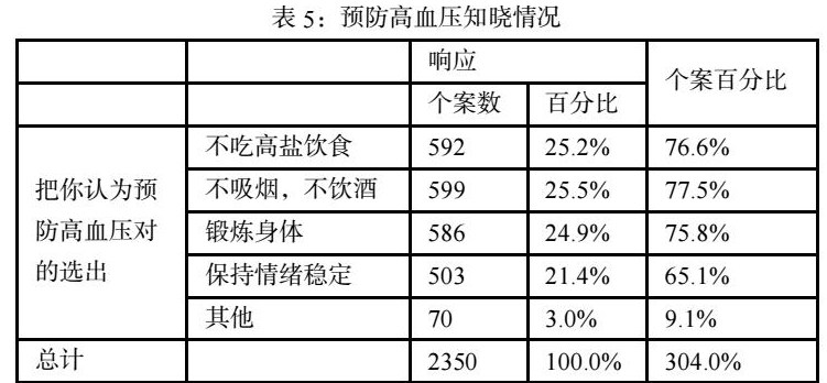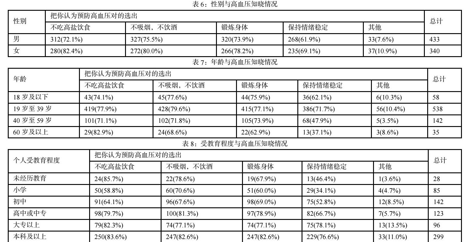 在对是否知道怎样预防高血压的调查中,共计2350响应人次,其中选择不吸烟不饮酒的占总响应人次77.5%,占比最高;选择保持情绪稳定的占总响应人次65.1%。将是否知道怎样预防高血压与性别、年龄、受教育程度做交叉表分析,结果显示,在433名男性被访者中,选择不吸烟不饮酒的占比75.5%,较另外四个选项占比最高;在340名女性被访者中,选择高盐饮食的占比82.4%,较另外四个选项占比最高。年龄方面,在60岁及以上的被访者中,选择保持情绪稳的仅占比37.1%,相较于其他年龄组,占比最低,且远低于低年龄组人群占比,说明在被调查者中,高年龄层人群对情绪于高血压的影响较低年龄人群了解程度低。在受教育程度方面,本科及以上文化水平的被访者中在多项原因选择中占比均高于小学学历及未经历系统教育人员,这表明在被调查者中,高学历人群对预防高血压的因素较低学历人群了解程度更高(详见表5~8)。