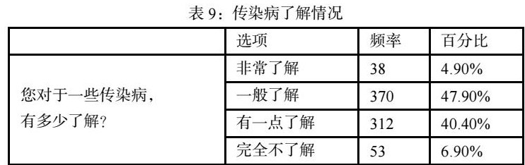 在对传染病了解调查中,选择非常了解的有38人,占比4.9%,占比最少;选择一般了解的有370人,占比47.9%,占比最高。将被访者对传染病了解程度与性别、年龄、受教育程度、家庭年收入分别做秩和检验,检验水准取0.05,结果显示,性别、家庭年收入与传染病了解程度的P值分别为0.992、0.628,大于检验 水准,说明传染病了解程度与家庭年收入、性别无关。在年龄、受教育程度与了解传染病知识方面,P值均小于0.01,差异具有统计学意义。以上结果说明,年龄与受教育程度是传染病了解程度的影响因素(详见表9)。