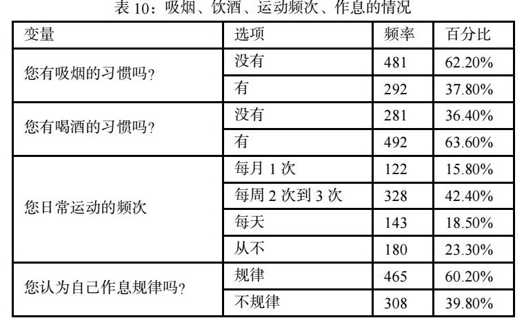本次调查对象中,有吸烟习惯的被访者占比37.8%;有喝酒习惯的被访者占比63.6%,饮酒行为相较吸烟在样本人群中更为普遍。在运动频次方面,选择每周2次到3次,占比42.4%,占比最高;选择从不运动,占比达到了23.3%,超过所调查人数的五分之一。在评价自己作息是否规律方面,60.2%人认为自己作息规律(详见表10)。