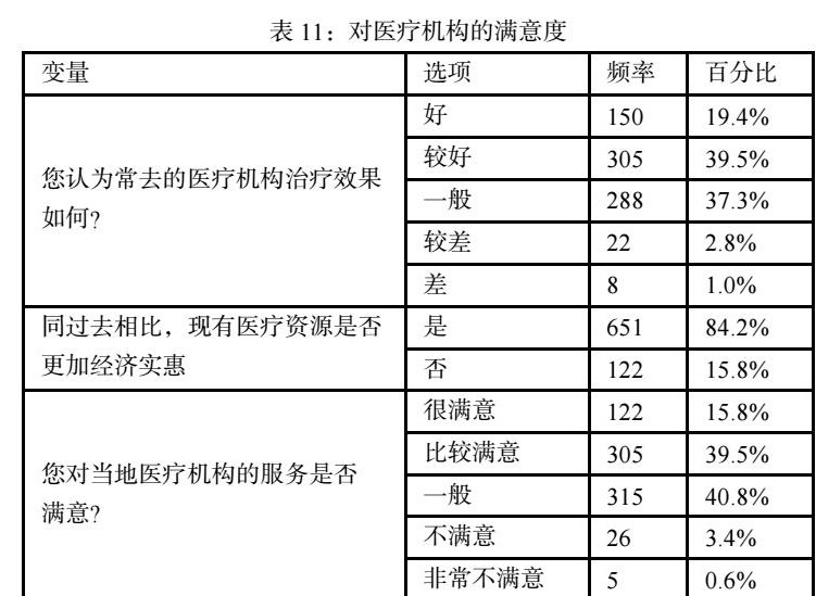 在对当地医疗服务评价的调查中,39.5%人认为其常去的医疗机构治疗效果较好,84.2%人认为同过去相比现有医疗资源更加经济实惠,仅有3.8%的人对常去的医疗机构效果感觉不足,4%的人对当地医疗机构服务存在不满意情况,说明被访者对当地医疗服务水平评价较好(详见表11)。