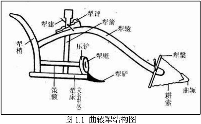 曲辕犁传入宋朝之后,在江南地区得到推广,而且形状、大小得到改进,(如图1.1所示)灵活方便,特别适合江南水田耕作。
