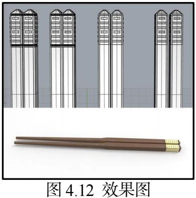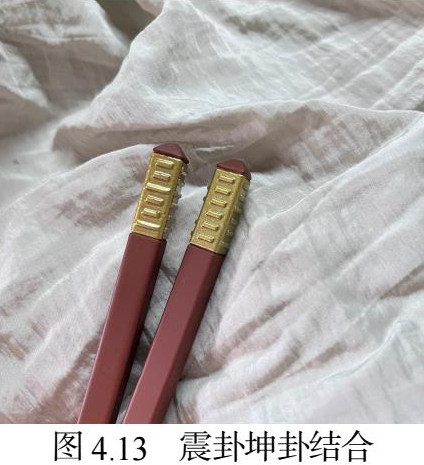 筷子采用了棕红色。“慈竹色如芦苇白,石楠顶结樱朱红”。设计点着重在筷子头,筷子的四个面分别是八个卦象中的其中一个,两双筷子合起来正好是八卦。当人们在日常生活使用拿取筷子的过程中有一种在求签算卦之感,可以看今天抽到了哪个卦。将周易文化潜移默化的融入人们的日常生活。使用者在使用过程中更有趣味感和参与感,对这种传统的周易文化也有了一定的兴趣。(如图4.12 所示)