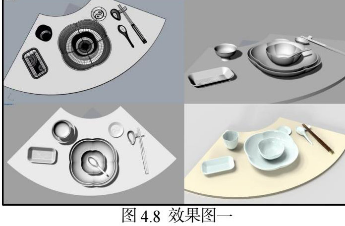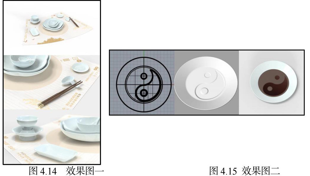 餐具的渲染结合餐垫的设计,更有整体的使用感,效果更直观。味碟模拟了加入了醋的样式,呈现出了八卦太极之感。(如图4.14 图4.15所示)