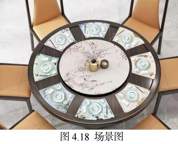 场景图展现,八个座位刚好对应八卦,每位座位都对应着一个卦位,中间圆桌,人们对着座位入座落座的时候有一种方位感的体现,再结合餐垫上的周易文化和农耕文化的知识 普及就让人们感受到一种农耕文化的氛围,让人们润物无声地学习了周易文化以及农耕文化。(如图4.18所示)