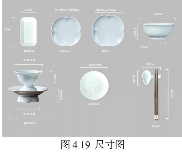 八寸骨碟分别为直径19.5cm对角为21cm高度为2.8cm,十寸骨碟24cm对角26cm高度5cm。味碟直径为8.8cm高度2cm,毛巾盘直径15cm*8.5cm,筷子长度为24.8cm,杯盏底足6.5cm直径12cm杯高5cm,碗口直径8.5cm。(如图4.19所示)