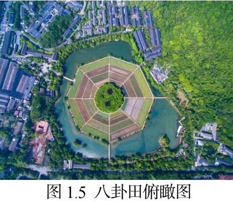 八卦田是田是景。八卦田由大小不同的田地按八卦图案而建,八卦元素按卦象分布四周,每三个爻组成一个卦,八个卦组成八卦图。八个卦的中心是太极图,太极图上阴阳两极载有两种色彩反差较大的树木。(如图1.5所示)
