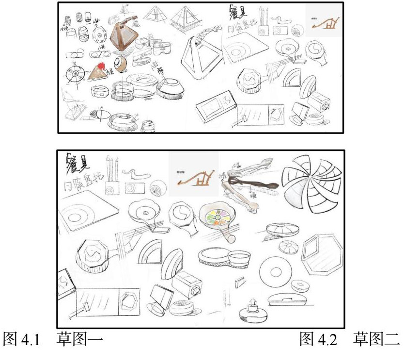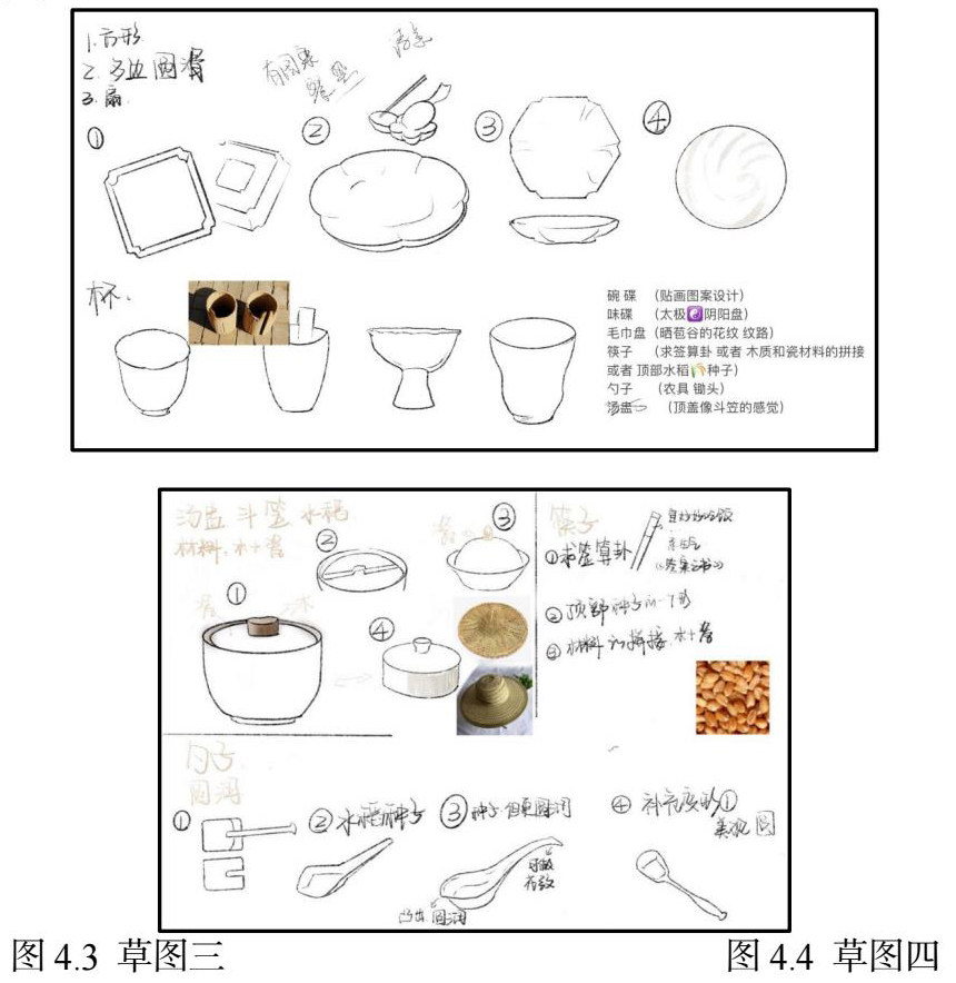 前期方案:通过大量的市场调研,融入八卦田的形态,加入农具例如曲辕犁的变形。通过对餐具形态形体的改变融入一些农耕元素与八卦元素。(如图4.1 图4.2所示)