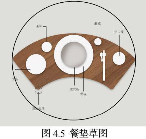 餐垫设计:在餐垫的设计上,考虑了大圆弧小圆弧对应的方向问题,前期设计是小圆弧靠着人使用的方向,但使用不方便是一个弊端,容易误伤也是一个问题。(如图4.5所示)