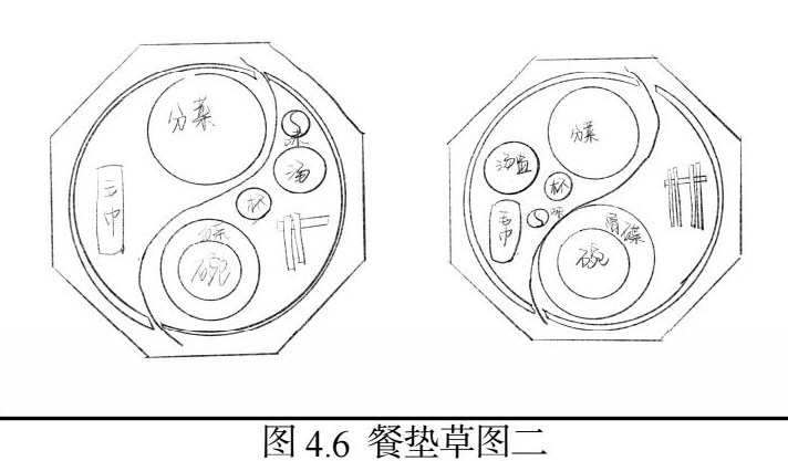 在餐垫设计样式的时候也考虑过完整的八卦形态,这样摆放的餐具种类又多又有八卦的整体感。(如图4.6所示)