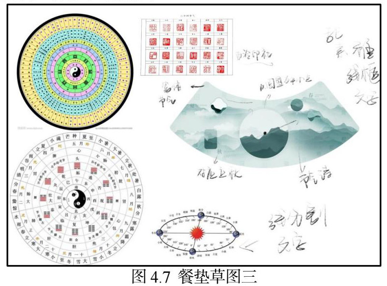 最终觉得以八卦为方位,大圆弧对应着用户使用方向,空间大,每一位座位餐垫代表着一个卦象,以四周围绕一个圆更有方位感。再以卦象展开到节气,整体色调更接近与古典宫廷色,素雅大方。节气农历以及纂书刻印加以修饰。(如图4.7所示)