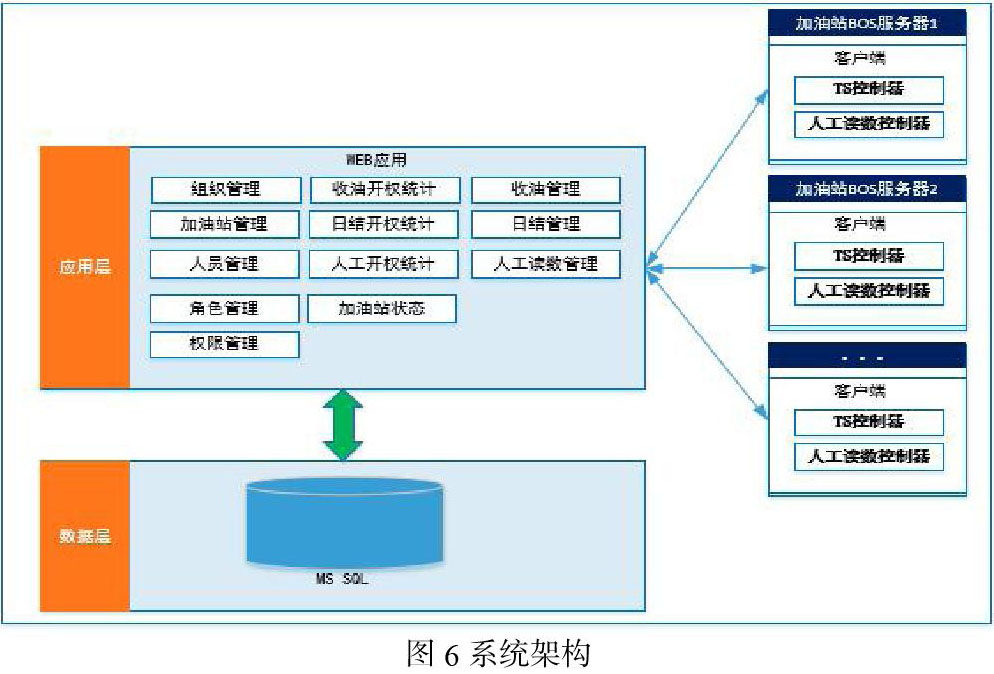中国石油黑龙江销售分公司在本期项目中,基于原有网络和监控系统架构,将Web应用部署在应用服务器,数据层数据库部署在数据库服务器,客户端部署在各加油站的BOS服务器。具体的系统架构图如图6所示: