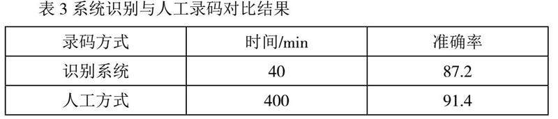 两种识别方式得出的结果如表2所示,从表中可以看出,相比较人工方式,采用识别系统的识别速度更快,但是相比较于人工的方式来说,人工方式的准确率比识别系统的准确率更高。