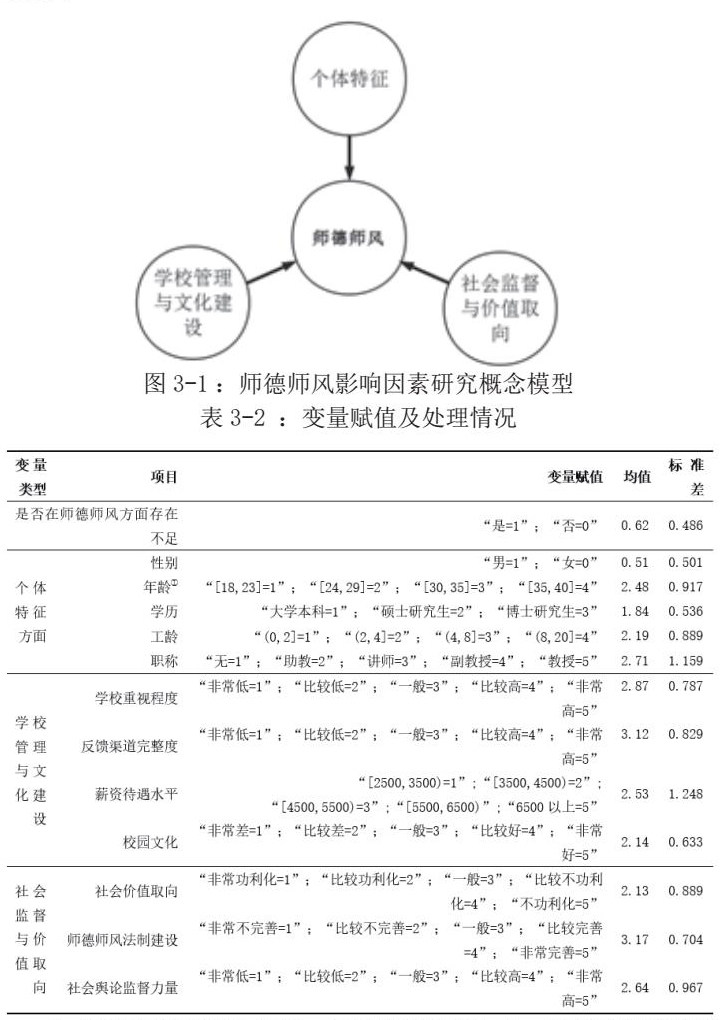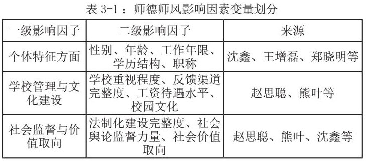 在研究师德师风影响因素方面,学者们多以定性研究为主,初步形成了一定的理论体系,为本文研究提供了一定的支撑,但在实证研究方面不足。赵思聪等(2019)在师德师风影响因素探析中指出,高校层面的主要影响包括:师德师风建设机制不完善、部门之间联动不足、高校管理机制挫伤教师自主性;角色认知层面包括:身心不成熟、未完成角色转变、对师德师风认知不清;价值观层面包括:社会观念、功利化教育观念[4]。熊叶等(2020)在分析高职院校师德师风建设中,从师德师风的认知、师德师风建设平键和建设意见三个方面进行分析并提出,提升认知、落实管理机制、发挥纪委职责、畅通反馈渠道、完善考评体系等建议[5]。沈鑫(2022)指出,影响因素包括:教师个人思想道德素质、经济收入、考评机制、舆论氛围[6]。基于上述等作者们的研究观点确定本研究的变量为:个体特征、学校层面、社会3个层面12个二级影响因子。具体如表3-1。