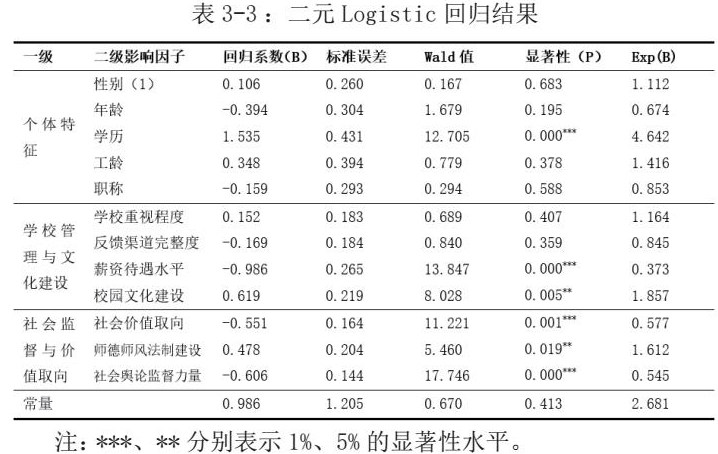 3.回归结果分析。回归结果表明,个体特征、学校管理与文化建设、社会监督与价值取向对四川省民办高校青年教师师德师风影响情况各不相同。其中,学历、薪资待遇水平、校园文化建设、社会价值取向、法制建设情况、社会舆论监督力量6个方面具有统计显著性,12个研究假设有6个通过,其余不通过。