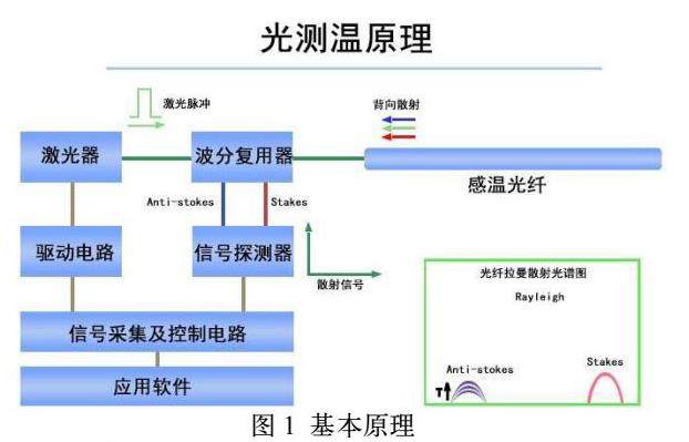 分布式光纤测温系统(DTS)是利用拉曼效应进行温度测量,当激光脉冲入射到光纤里,在发送端得到背向散射光,并进行分析。拉曼散射光的强度与温度成正比,测量散射光强度得到沿光纤分布的温度。