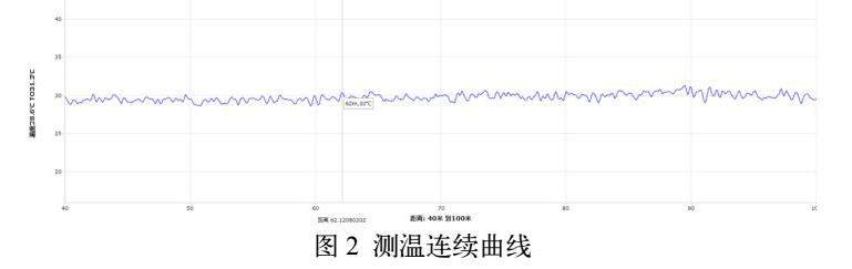 第四,数字粮情测控系统在测定粮温时,受限于测温点间的距离,无法有效果获取测点间温度数据。而光纤测温系统中的光纤介质采用连续性布设,通过设置系统可以读取任意一段距离的温度数值生成对应的温度变化曲线。