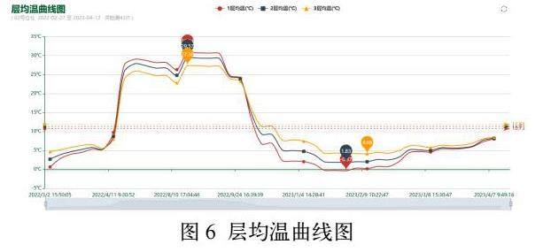 实验方法为每星期二使用此系统测定一次粮温,通过探查粮温变化的方式查看和分析粮情变化情况。累计收集一年的数据后,按照具体的温度数据绘制测定期间按时间变化的层均温曲线图(如图6)和光纤连续测温曲线图并且绘制测温报表并与上一次测温相对比。用以检查光纤粮情测控系统的应用效果,并与现有正在使用的数字粮情检测系统的应用效果进行对比。