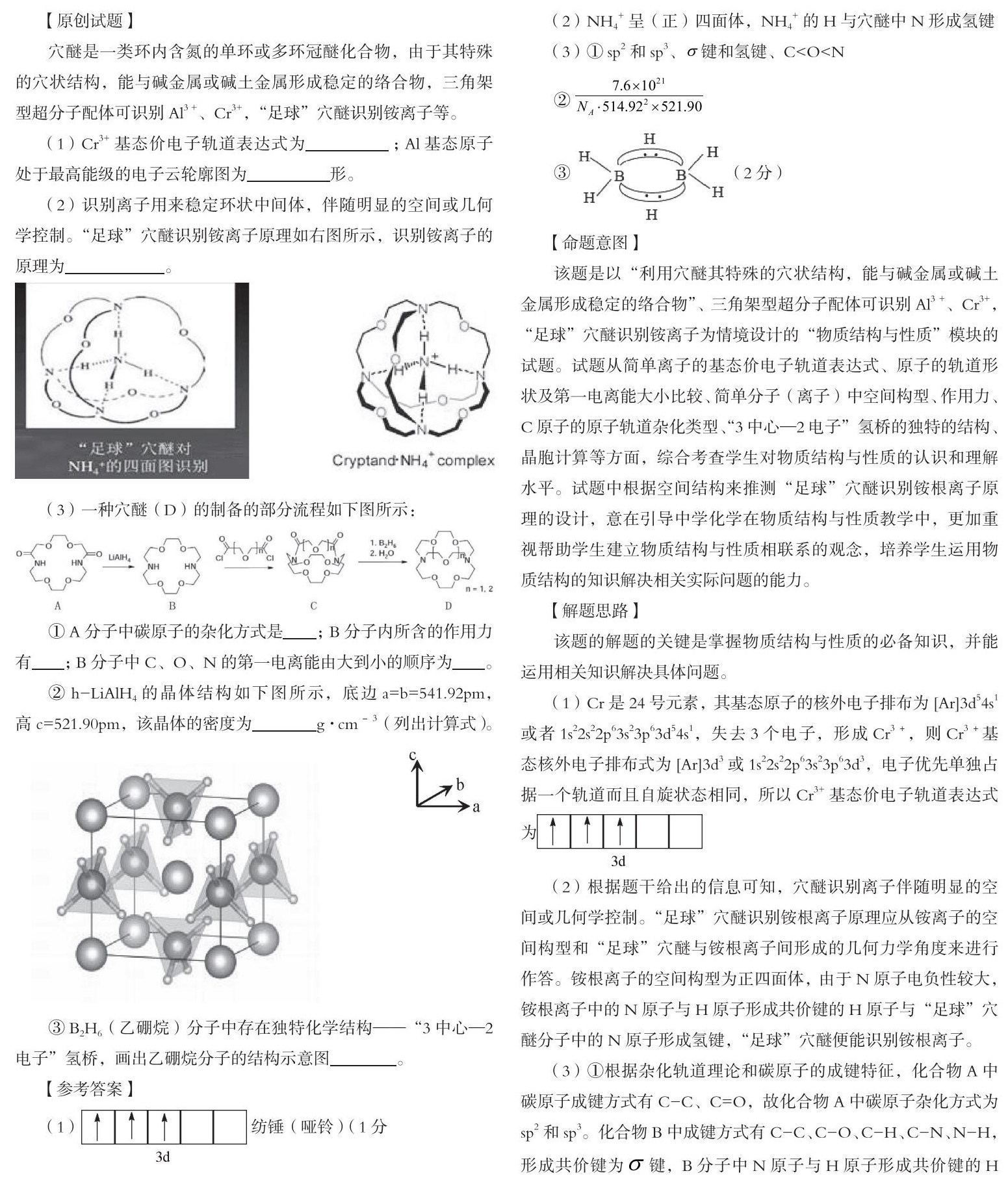 该题是以“利用穴醚其特殊的穴状结构,能与碱金属或碱土金属形成稳定的络合物”、 三角架型超分子配体可识别Al3 +、Cr3+,“足球”穴醚识别铵离子为情境设计的“物质结构与性质”模块的试题。试题从简单离子的基态价电子轨道表达式、原子的轨道形状及第一电离能大小比较、简单分子(离子)中空间构型、作用力、C原子的原子轨道杂化类型、“3中心—2电子”氢桥的独特的结构、晶胞计算等方面,综合考查学生对物质结构与性质的认识和理解水平。试题中根据空间结构来推测“足球”穴醚识别铵根离子原理的设计,意在引导中学化学在物质结构与性质教学中,更加重视帮助学生建立物质结构与性质相联系的观念,培养学生运用物质结构的知识解决相关实际问题的能力。