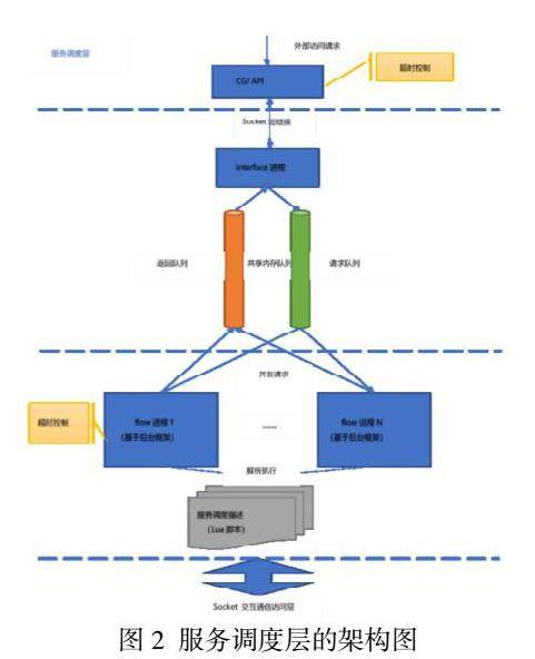 具体来看,服务调度层依托C++异步并发执行框架,构建底层通信调度基础。通过共享内存队列,实现多个flow调度进程并发执行,处理外部请求。Flow进程负责解析服务调度描述脚本(Lua脚本),并将解析的业务调度信息,进一步传递给后端通信访问层,去执行真实的外部接口的访问调用。同时,也负责将外部接口返回的结果,传递给Lua脚本做结果的个性化处理。