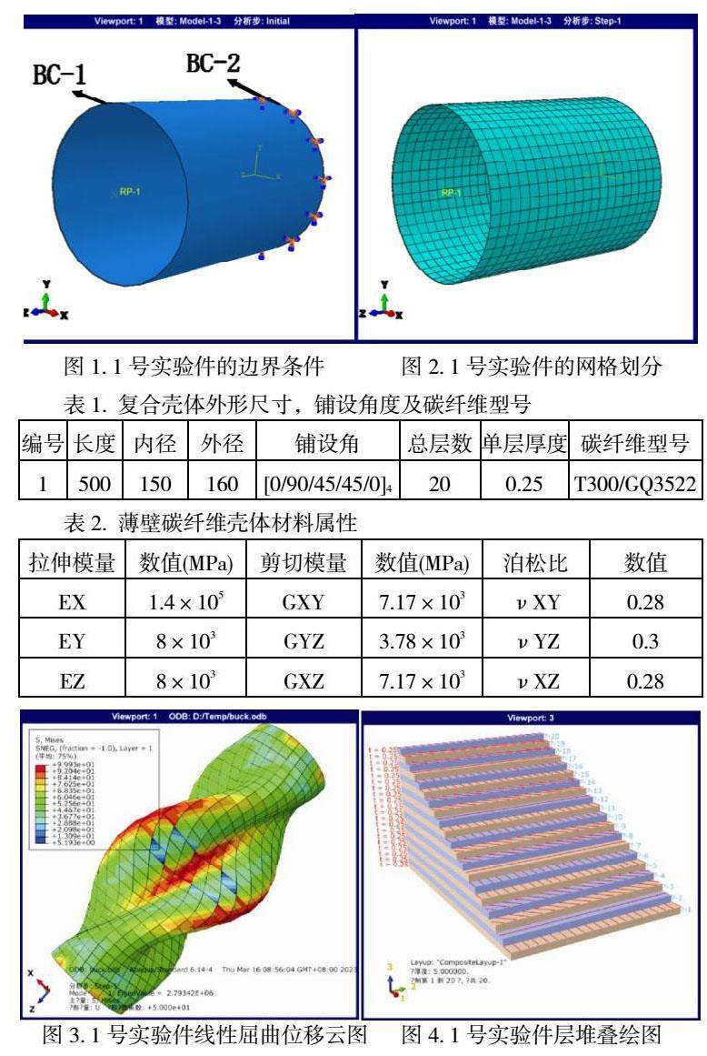 利用ABAQUS软件建立复合材料层合圆柱壳试验件模型,采用XYZ直角坐标系,将被加载底部平面建于XY平面中,加载方向与Z轴方向平行。试验件外形尺寸及材料属性见表1及表2。边界条件见图1,设定壳体底部边界BC-2为全固定,即轴向位移和转动位移都为0。设定BC-1转动载荷为0,在BC-1圆心处设定耦合参考点,在参考点出加载数值大小为1的集中力。采用屈曲分析,设定最大增量步后得出分析结果。材料行为定义为弹性,考虑了其正交各向异性特性,类型为单层板共计20层,材料方向设定为法向,实验件的数值模型采用图2所示“S4R”型的壳体元素进行网格划分。