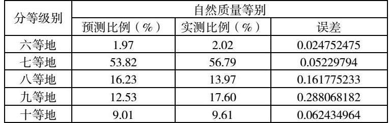 本文以安康市汉滨区的农用地分等质量的“冬小麦-分等因素-质量分”的土壤有机质为例,对5657个样点单元进行上述模型测算后得到结果:土壤有机质含量(%)预测分级4.0-3.0,样点数492,因素参考分90;3.0-2.0,样点数1856,因素参考分80;2.0-1.0,样点数2349,因素参考分70;1.0-0.6,样点数600,因素参考分60;<0.6,样点数360,因素参考分50,该因素权重0.21。对所有参与模型运算的影响因素均按照B-P神经网路模型运算,核算样点综合分等值,得出每个指标的分级值和权重,再利用克里格差值等差值方法计算出以研究区5657个样点得到的区域农用地分等质量综合值,根据区间划分得出最终的评价级别。本例利用模型运算与该地实际的分等报告得出对比,基本达到预测结果。