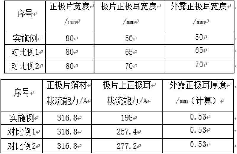 将极耳作为输出导线,依据电力工程上导线载流量计算,正极耳铝金属金属导体截面和载流量关系:(横截面积/平方毫米)铝载流量/A=7.5;(根据我司设备及工程制备能力,极片宽度80mm,极片上极耳宽度最大值为70mm)