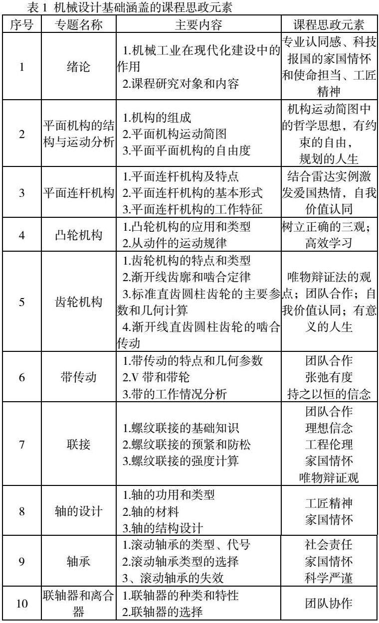 2019年3月,习近平总书记主持召开学校思想政治理论课教师座谈会并发表重要讲话,他指出:“要坚持显性教育和隐性教育相统一,挖掘其他课程和教学方式中蕴含的思想政治教育资源,实现全员全程全方位育人。”[1]《机械设计基础》是一门介绍机械设计基础知识和培养学生机械设计能力的课程,它综合了机械原理、机械设计、金属材料的基本内容,是一门具有综合性强、结合工程实际紧密特点的技术基础课。在教学过程中要综合运用先修课程中所学到的有关知识与技能,从机械系统的设计观点出发,旨在培养学生初步具有设计简单机械传动装置的能力,本课程在教学内容方面应着重基本知识、基本理论和基本方法,在培养实践能力方面应着重设计技能的基本训练。为学生学习后续专业课中的机械部分和以后的工作岗位打下一定的理论基础[2]。