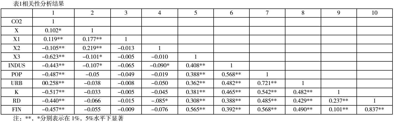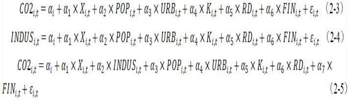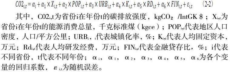 其中,C02i,t为省份i在年份t的碳排放强度,kgCO₂/IntGK$;Xi,t为省份i在年份t的能源消费总量,千克标准煤(kgce);POPi,t代表地区人口密度,人口/平方公里;URBi,t代表城镇化率,%;Ki,t代表人均固定资本,万元;Rdi,t代表人均研发经费,万元;FINi,t代表金融贷存比,%;i代表不同省份,t代表不同年份;αi,α1,α2,α3,α4,α5,α6为各个变量的回归系数,εi,t为随机误差。