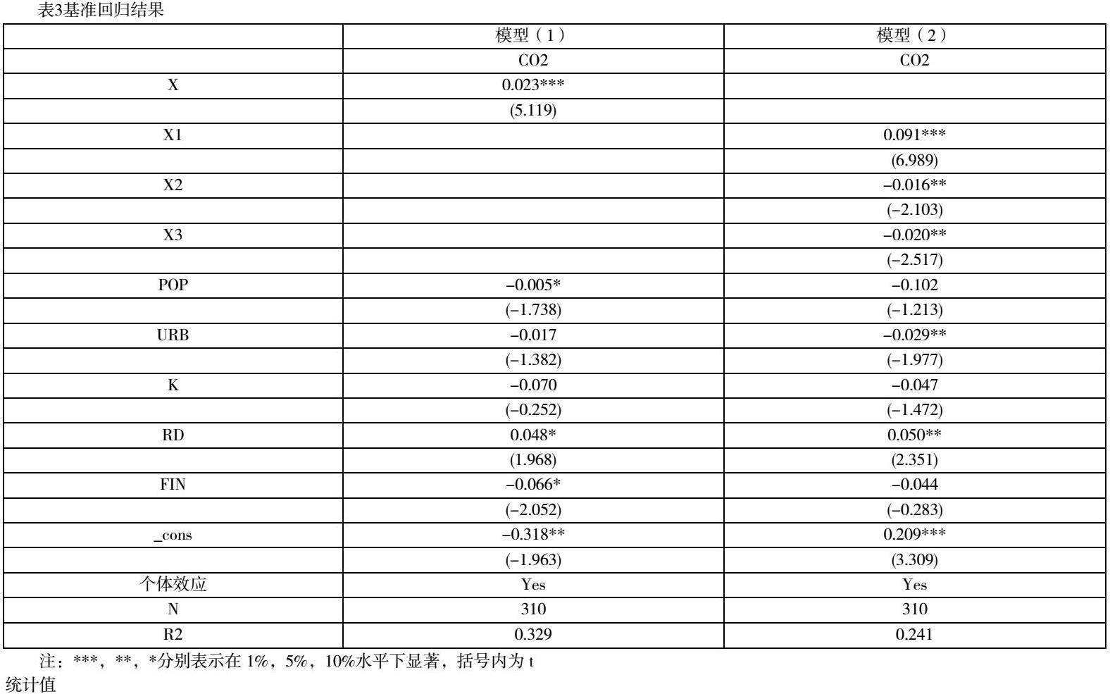 为厘清能源消费结构与碳排放强度之间的影响程度,以能源消费总量X、煤炭消费占比X1、电力消费占比X2以及天然气消费占比X3等为解释变量,以碳排放强度CO2为被解释变量,运用多元线性回归方法进行回归,结果如表3所示。