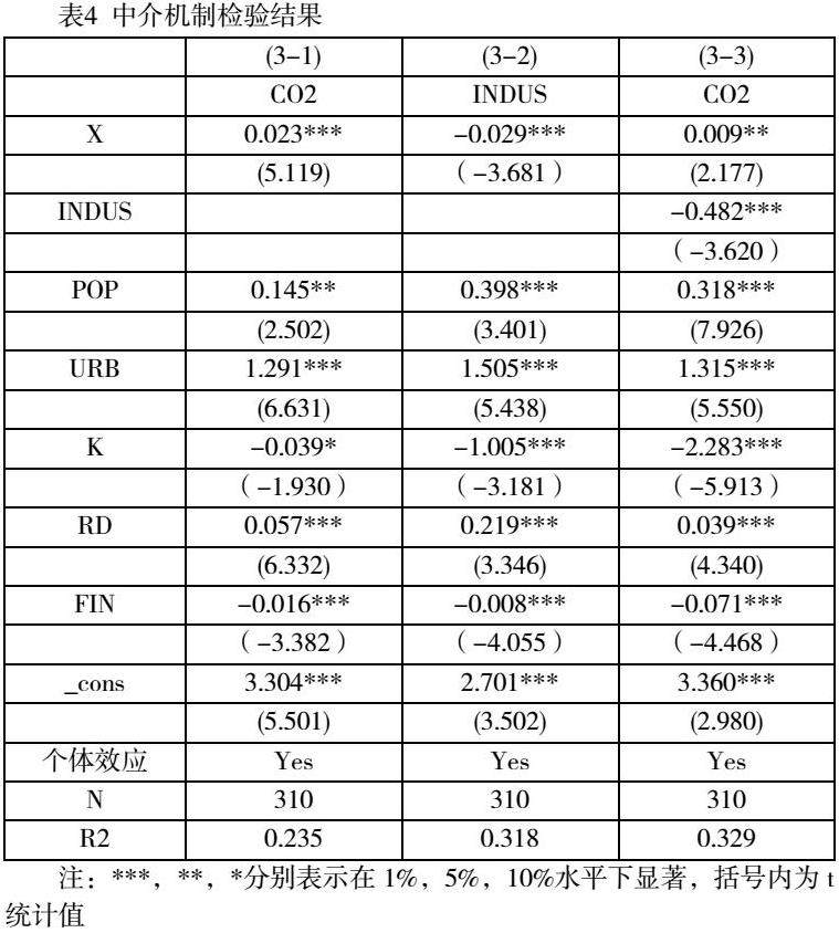 为检验产业结构的中介机制,结合中介机制检验方法,得到数据结果如表4所示: