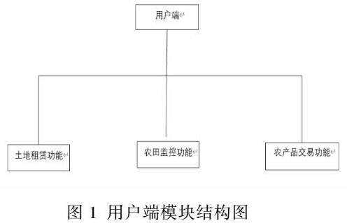 系统采用分布式架构,前端由微信小程序实现,后端由云服务器支持,数据存储和管理通过云数据库完成。用户端由土地租赁、农田监控、农产品交易三部分组成。用户端模块结构图如图1所示。