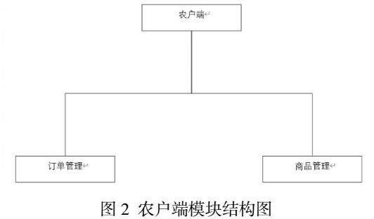 为了提高农户能够便捷的处理订单信息、提供额外服务,农户也可以自由编辑商品简介,让客户更好地了解商品,从而提高客户的购买意愿,促进商品的销售。将农户端分为订单管理和商品管理两部分组成。农户端模块结构图如图2所示。
