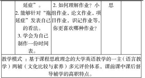 教学模式 :基于课程思政理念的大学英语教学的一主(语言教学)两辅(文化比较与素养)多元评价体系,课前课中课后督导辅学的高职特点。