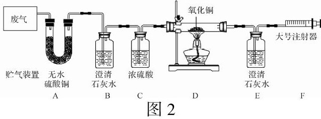 在实验室相对封闭的装置内燃烧某种含碳、氢、氧元素的垃圾,对产生的废气成分(不考虑气态有机物)按如图2所示的装置进行检验。厘清各装置用途后,学生就能明确注射器的用途,通过拉动注射器,让废气依次通过装置。F处的大号注射器,可以引导气体流向,其另一个主要作用是能收集尾气或贮存气体。