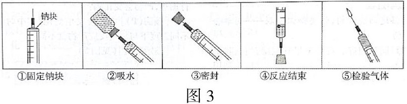 一种是通过实验现象进行推测,钠会游走是因为受到了力的作用,这个无形的力应该就是产生的氢气推动它运动的。或者在实际的课堂教学过程中,当钠的量比较多时,由于反应放热剧烈,氢气又是可燃性气体,有时候会看到钠“燃烧”了起来,推测是产生的氢气在燃烧。因此这个实验是较危险的,要在教师的指导下完成,生成的气体也较难收集。借助注射器进行实验改进,既能满足安全原则,又能很好地收集产生的气体并进行检验,如图3[3]。
