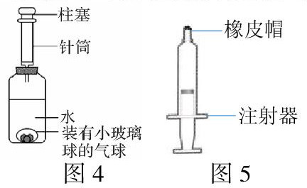科学是一门综合性学科,能在科学学科中融入各学科的知识,结合各学科的知识解决问题是科学的学科素养的体现。结合物理学科的特点,学习浮沉条件的相关应用时,注射器可以很好得控制气体或者液体的进出,例如模拟潜水艇的进水和排水等。如图4所示实验装置有良好的密封性,当将针筒的柱塞用力上提时,发现装有小玻璃球的气球在上浮并露出了水面。针对实验中的气球进行分析,当用力提起注射器柱塞,瓶内气体压强减小,气球受到的压强减小,球内压强大于球外压强时,气球的体积会逐渐变大,当浮力大于重力时就会使气球上浮。柱塞的变化可以改变瓶内气压大小,再改变气球内的气压,知识点的关联密切,结构性强。为探究光照强度对绿色植物光合作用的影响时,可以取较大的注射器,在注射器内放入已进行暗处理的叶片,并将注射器放在实验设置的不同强度的光强下,相同时间后即可记录注射内生成气体的体积,如图5。