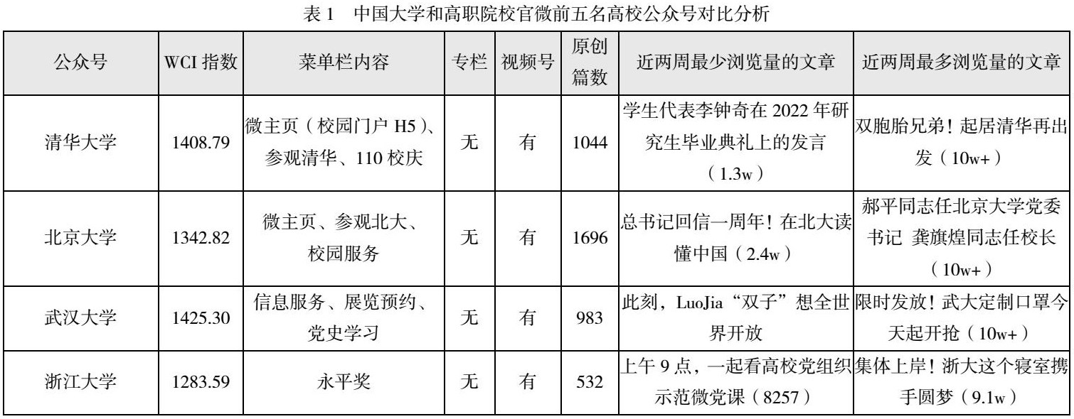 微信公众号也是网络思政建设的另一大门户平台。根据中国青年报发布的“2020-2021年度中国大学官微百强”名单,对其中中国大学和高职院校的前5所高校的微信公众号,分别栏目、服务内容和WCI指数进行对比分析,结果见表1。