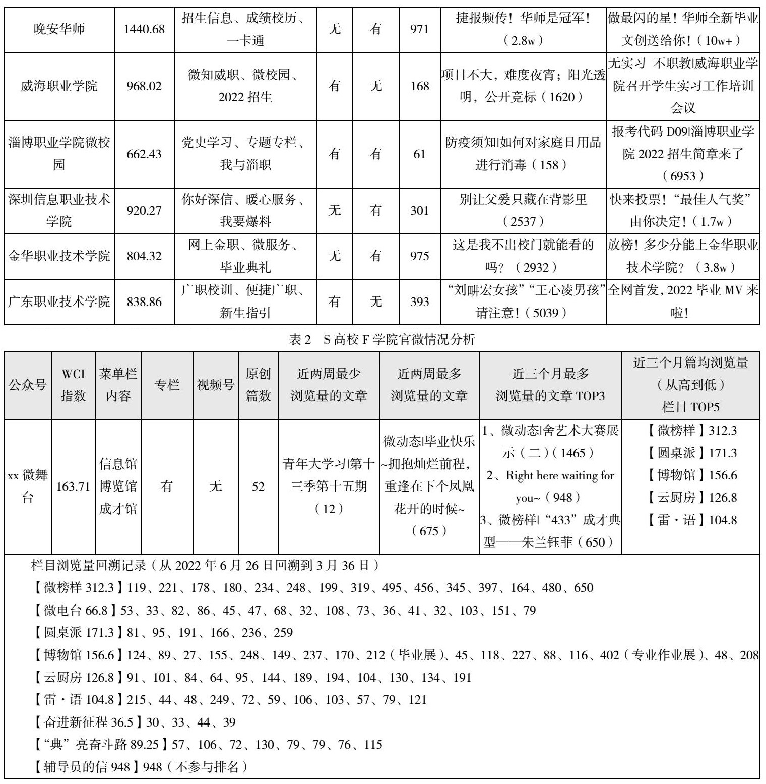 相比于本科院校,职业院校前五的官微关注度和内容打磨明显不足,但是设置专栏,部分职业院校开设了视频号,其中与学生息息相关的内容关注度也是居高的,部分科普、常识性推文鲜有关注度。