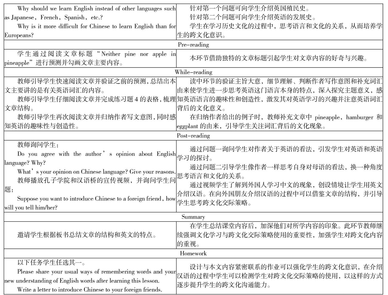 本文以新外研版高中英语必修一Unit2“Neither pine nor apple in pineapple”为例进行教学设计,探讨如何立足于文本分析和学情特点设计教学活动,引导学生形成跨文化意识和学习跨文化交际策略。