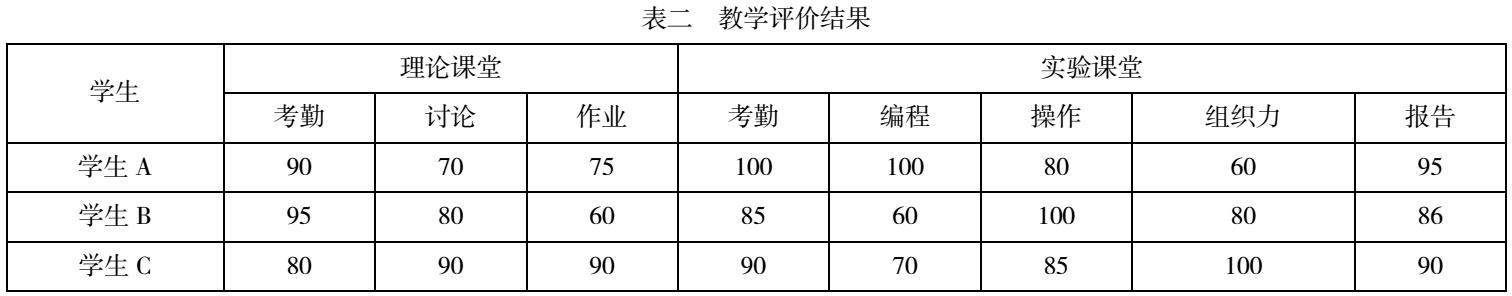 (2)弱化定性的考核评价结果。取消教学评价结果中只给出一个最终的评价结果,对教学活动全过程进行多方位监测与评价,取消各评价方面间的权重,多教学过程全部呈现在教学评价结果中,实践环节有实践环节教学评价指标和结果,理论环节有理论环节教学评价指标和结果,而且实践环节和理论环节还可以包含有各自更细化的教学评价指标和结果(如表二)。让学生尽情地发挥各自的爱好和长处,同时也不回避其课程评价的短处。让每个学生都能在课程全过程中找到自己的兴趣点、发光点。