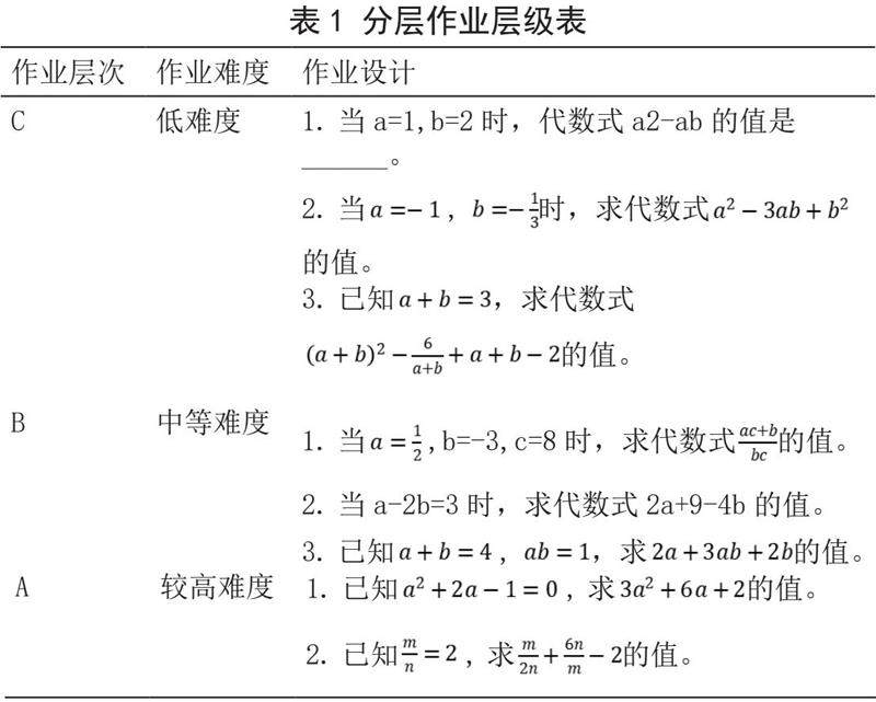 在设计数学分层作业时,应着眼于学生的最近发展区,围绕作业量和作业难度进行综合分析。可以先从中等水平学生、中等难度的题目及作业量着手,将其作为B层作业,在此基础上减少简单题,增加开放题、综合探究题等方式设计A层作业;通过增加基础题,减少难题等方式设计C层作业。由于教师针对不同学生进行分层练习,练习难度有梯度,这样既可以让全体学生都得到成功的愉悦,又可以让不同层次的学生都得到提升。对作业显性分层,对学生要做到隐性分层,引导学生自主选择适合的作业,且对学生隐性划分的层次不是固定不变的,而是根据学生的答题结果适时引导,动态调整。以七年级上册《代数式的值》课后作业设计为例,在设计分层作业时,分三种层次出题,如表1。由于C层次的题与课本的例题类似,学生解题难度不大,学生很快就可以完成;A层次的题有变形与转换的过程,稍有难度。引导学生选择其中的1-2类练习,一般情况下,不同层次的学生的自选情况与教师期望的选择差别不大,教师可根据学生的作答情况,对部分学生提出建议。