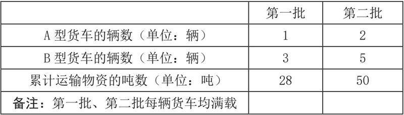 入汛以来,某地遭遇强降雨,引发洪涝灾害,人民的生活受到了极大的影响。“一方有难,八方支援”,某市筹集了大量的生活物资,用A、B两种型号的货车,分两批运往受灾严重的地区,具体运输情况如下: