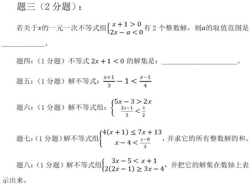 初中数学作业量太多不好,太少也不行,一般以三十分钟的作业量为宜。在控制作业量的前提下,可通过制定作业选择的规则,鼓励学生完成更具有挑战性的作业,以丰富学生的情感体验。在《不等式(组)及其应用》综合复习设计分层作业时,每次以八题为一组,其中一道3分题,二道2分题,五道1分题,由学生自由选择、组合题目来完成至少6分。分层题目设计如下。