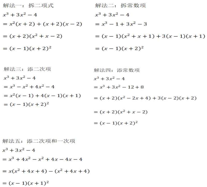 在作业设计中,教师适当的引导学生在解决问题时运用多样化的途径和手段,可以激发学生去发现和创造的强烈欲望,加深学生对所学知识的深刻理解,训练学生对数学思想和数学方法的娴熟运用,锻炼学生思维的广阔性和深刻性、灵活性和独创性。“一题多解”是多样化的手段解决问题的典型方法,可以让学生体悟不同解题方法之间的差异,深化理解所考查知识点,可以引导学生对题目多方位思考,增强解题能力。比如,分解因式的题型和方法有很多。同样以八题为一组作业,在作业规则中指出,用一种方法解答的要做六道题,用两种方法解答的只做三道题,用三种及以上方法解答的只做一道题。在实际作业中,针对因式分解x3+3x2-4,用拆项和添项的方法,根据作业反馈信息,有学生提出了五种解法。