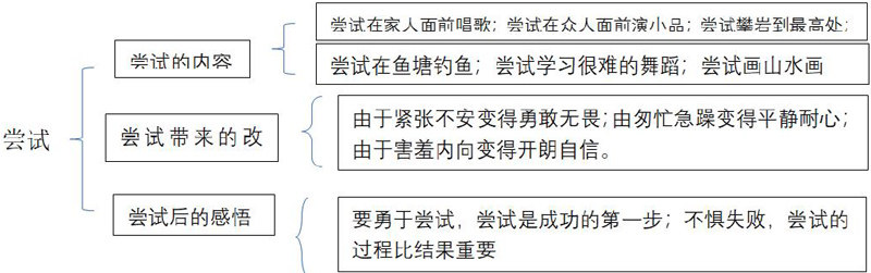 (四)教学生学会运用思维导图。写作文时,学生通过思维导图来分解自己的写作思路,让学生更清晰地了解自己的写作途径。例如写《尝试》这篇文章:
